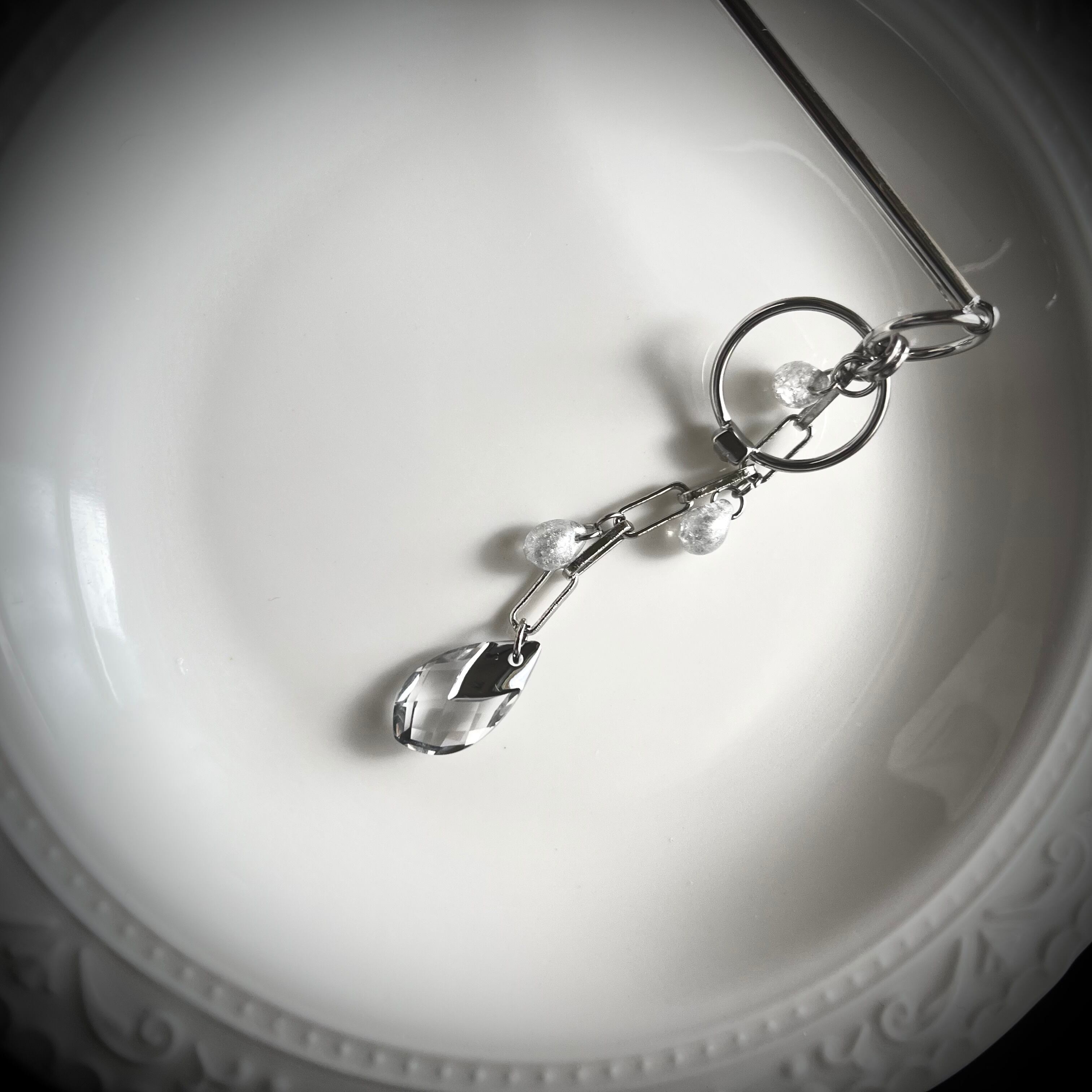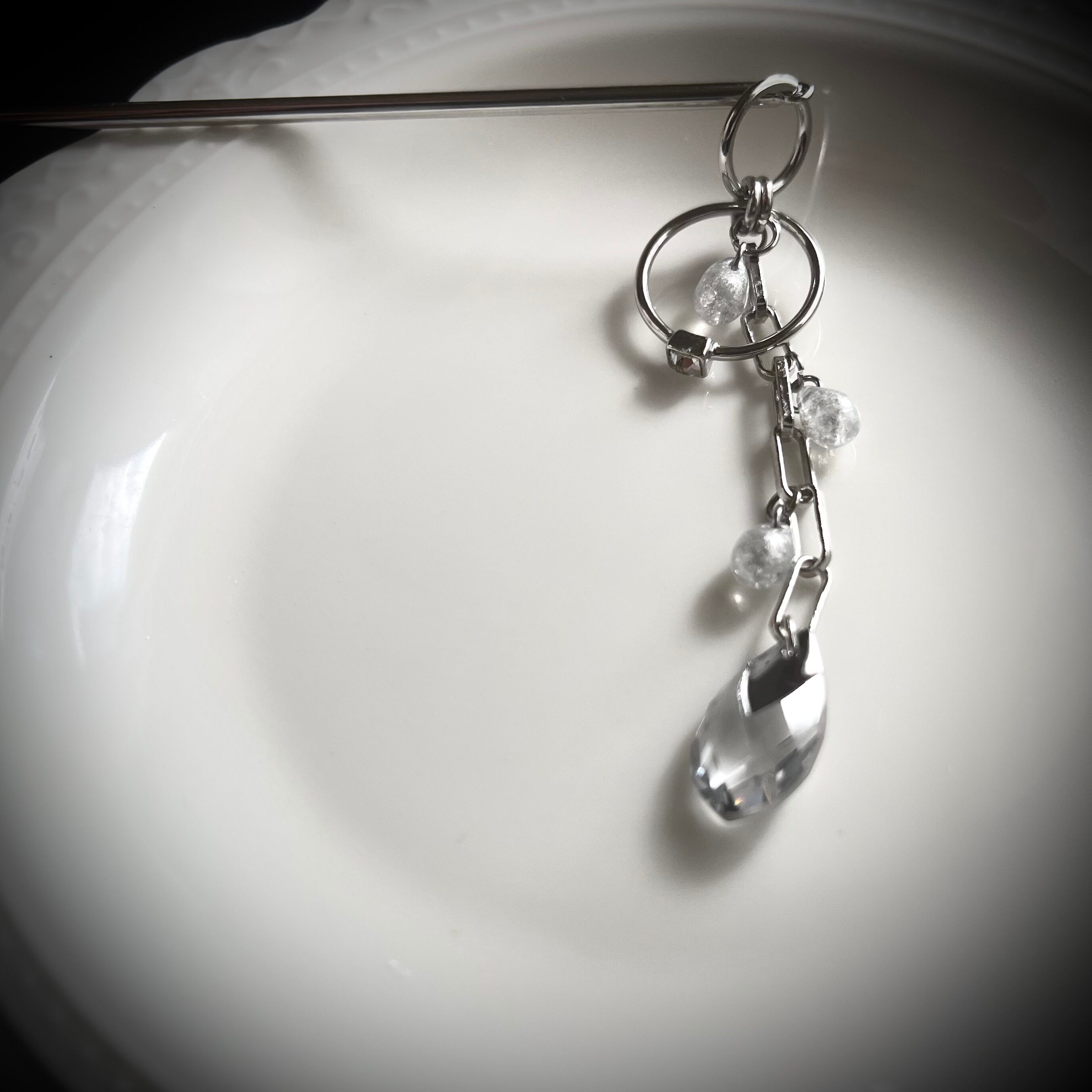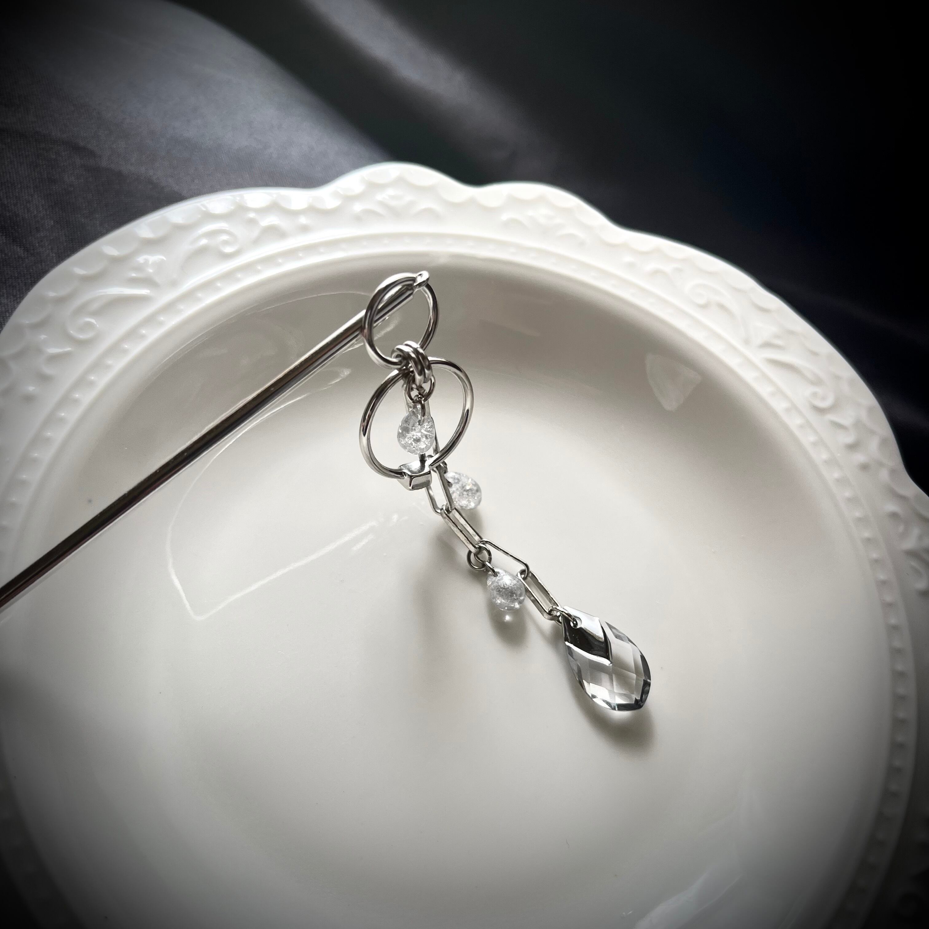 クリスタルのチャームやチェコビーズ、リングモチーフにはシルバーナイトを合わせた、クリアな透明感とシルバーを基調にした簪に仕上げました。