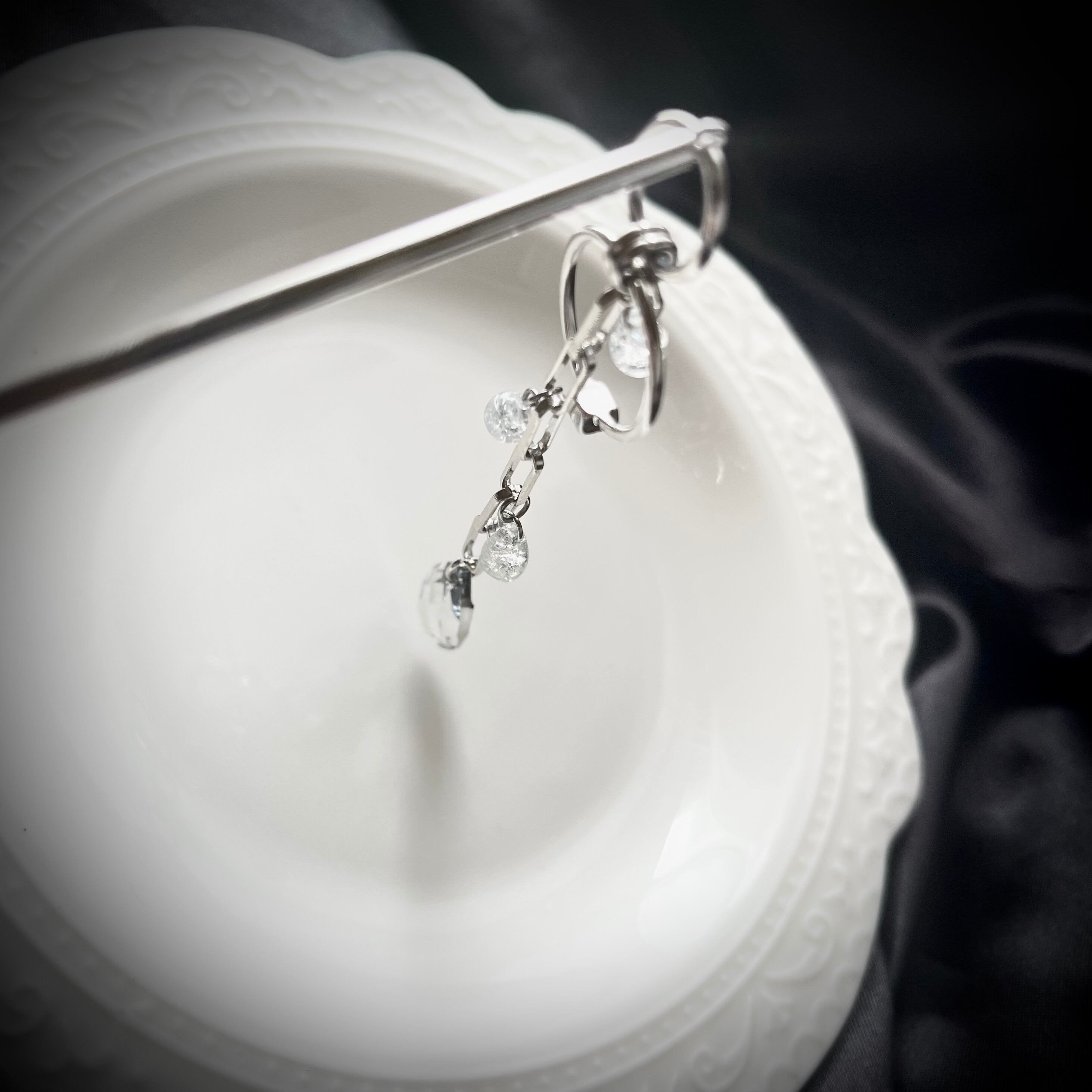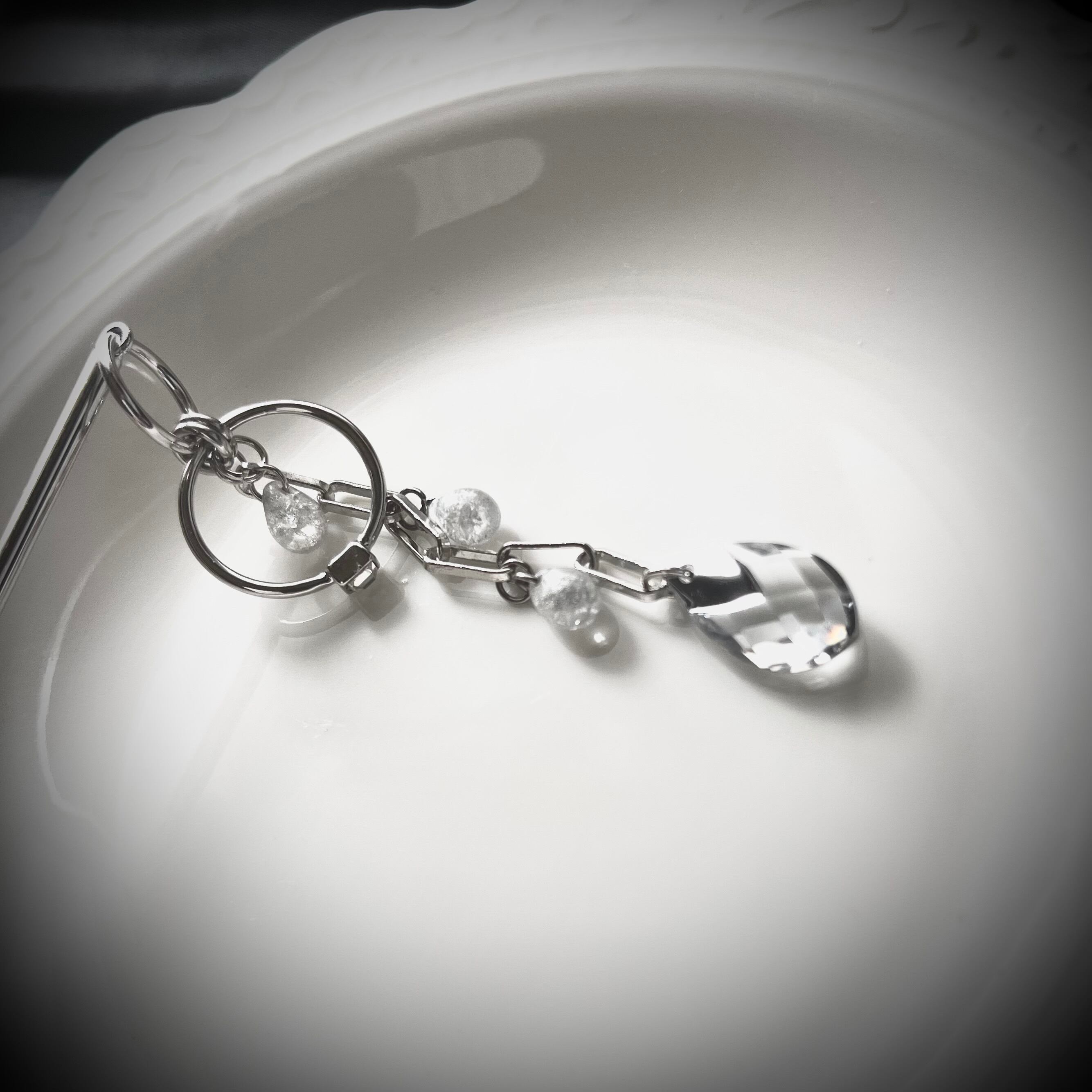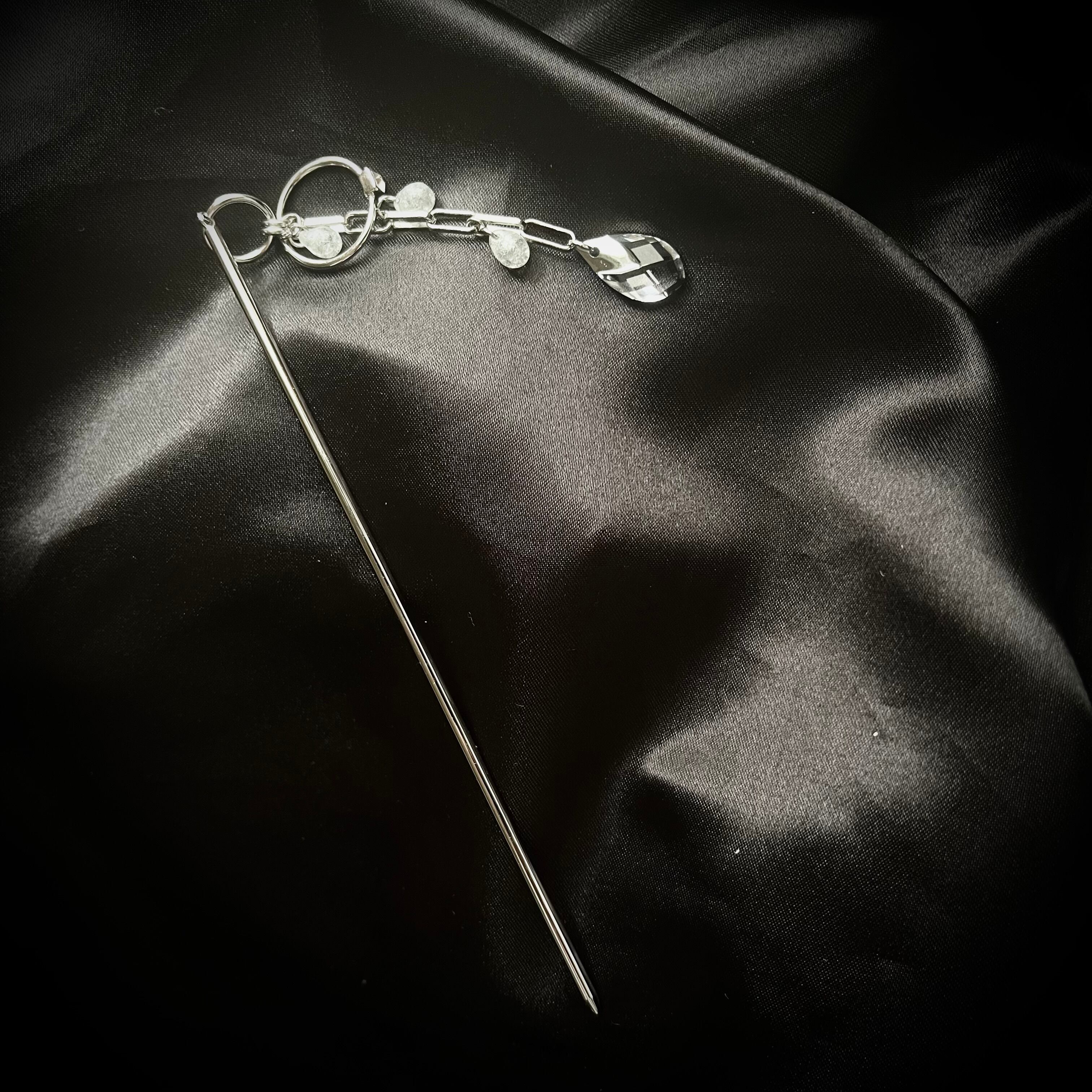 クリスタルのチャームやチェコビーズ、リングモチーフにはシルバーナイトを合わせた、クリアな透明感とシルバーを基調にした簪に仕上げました。