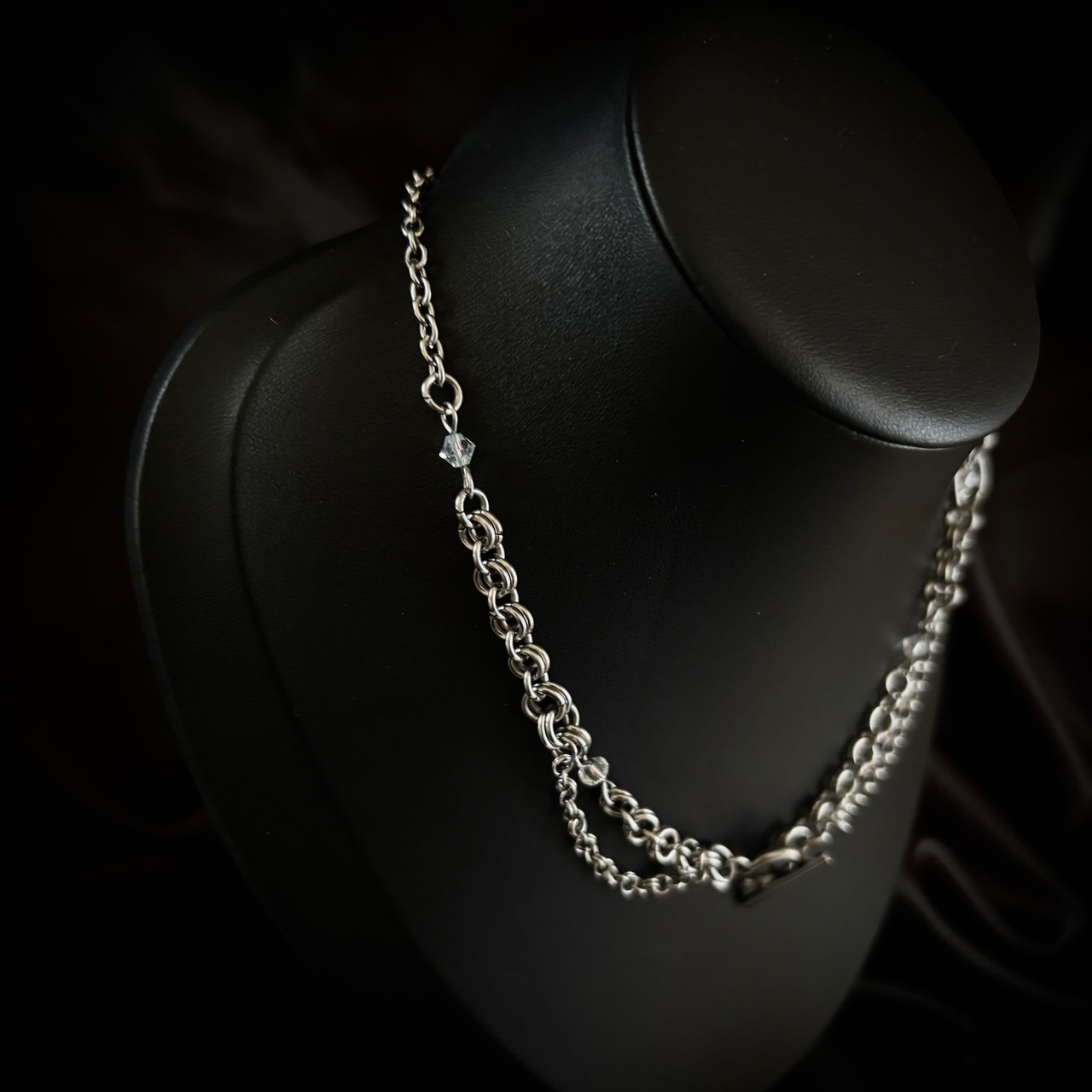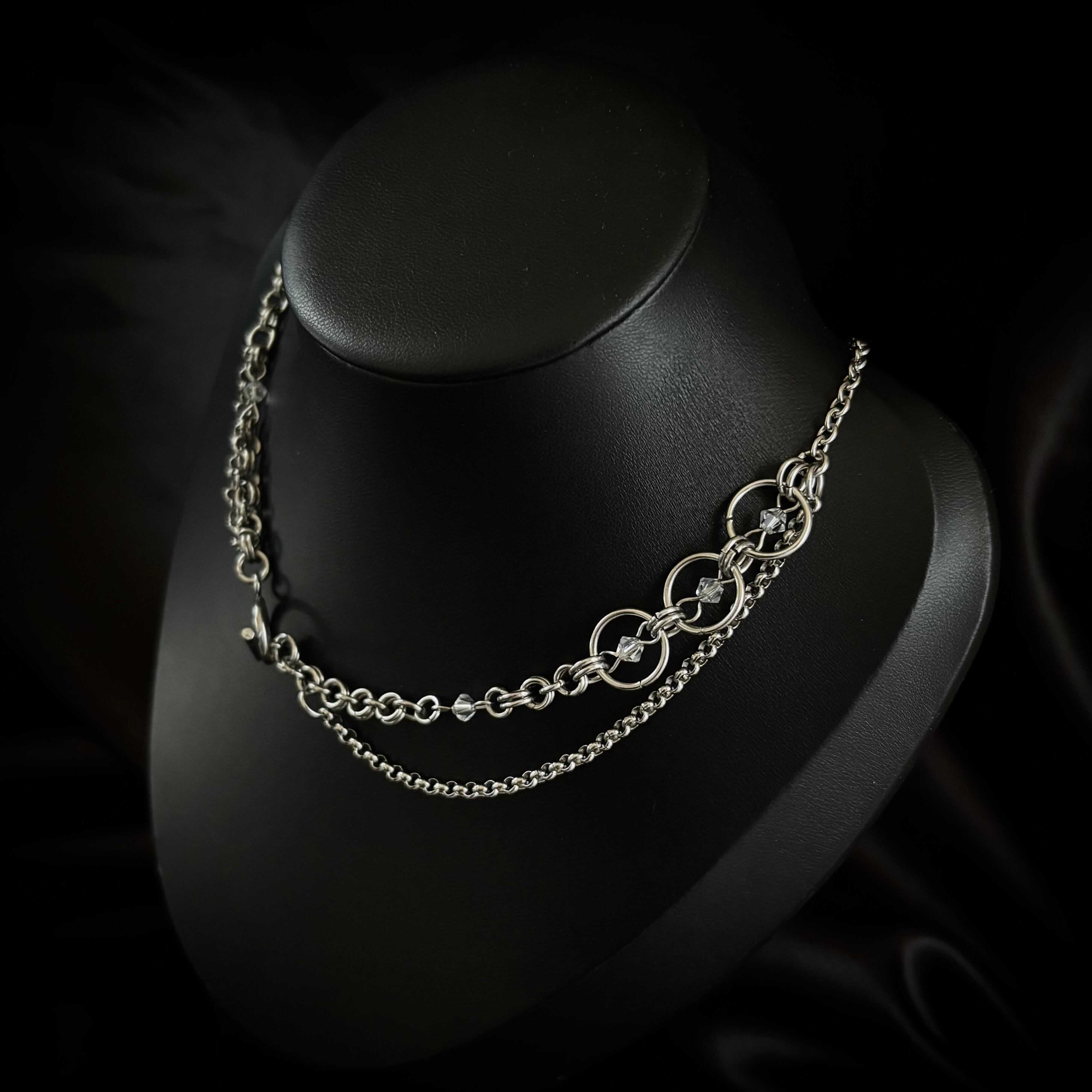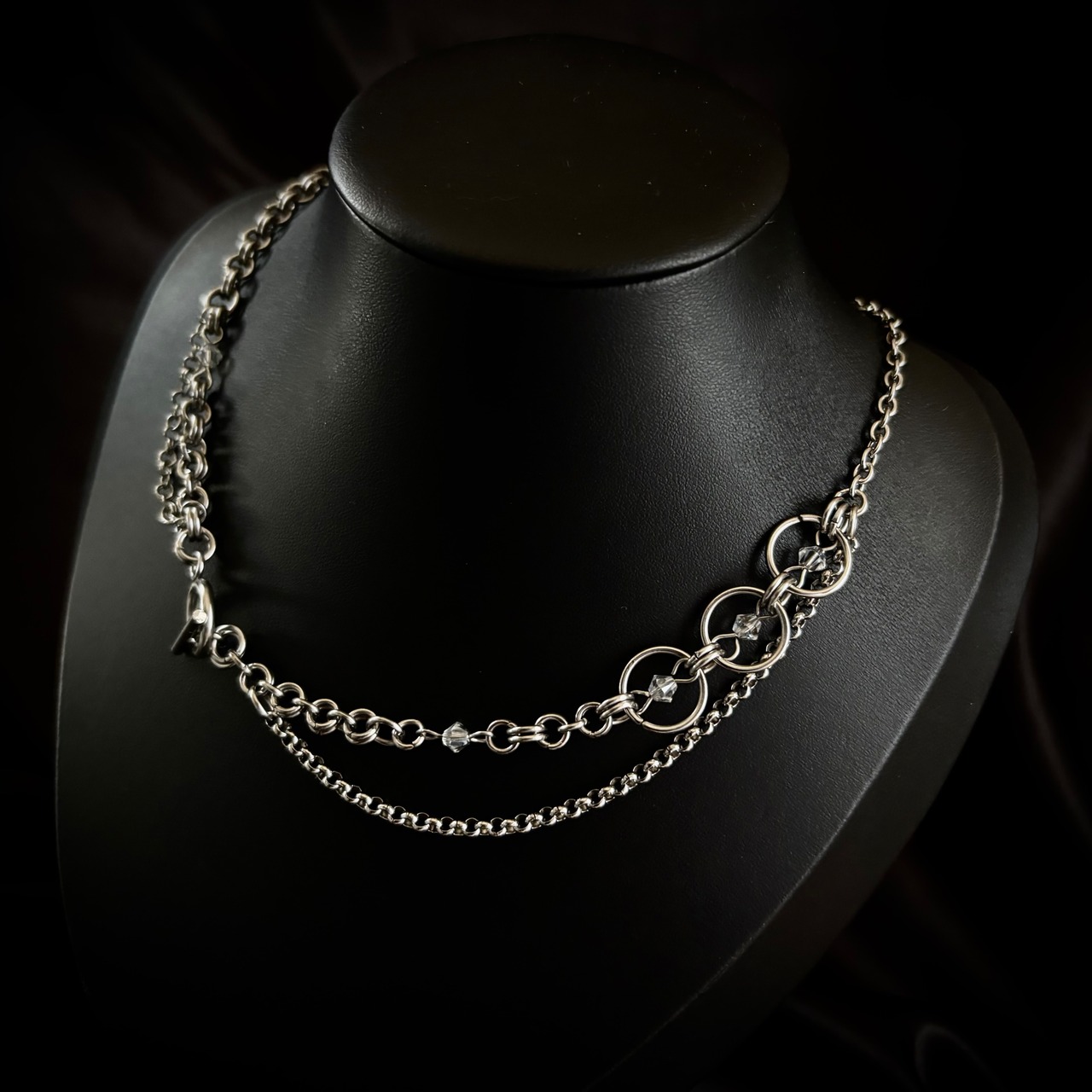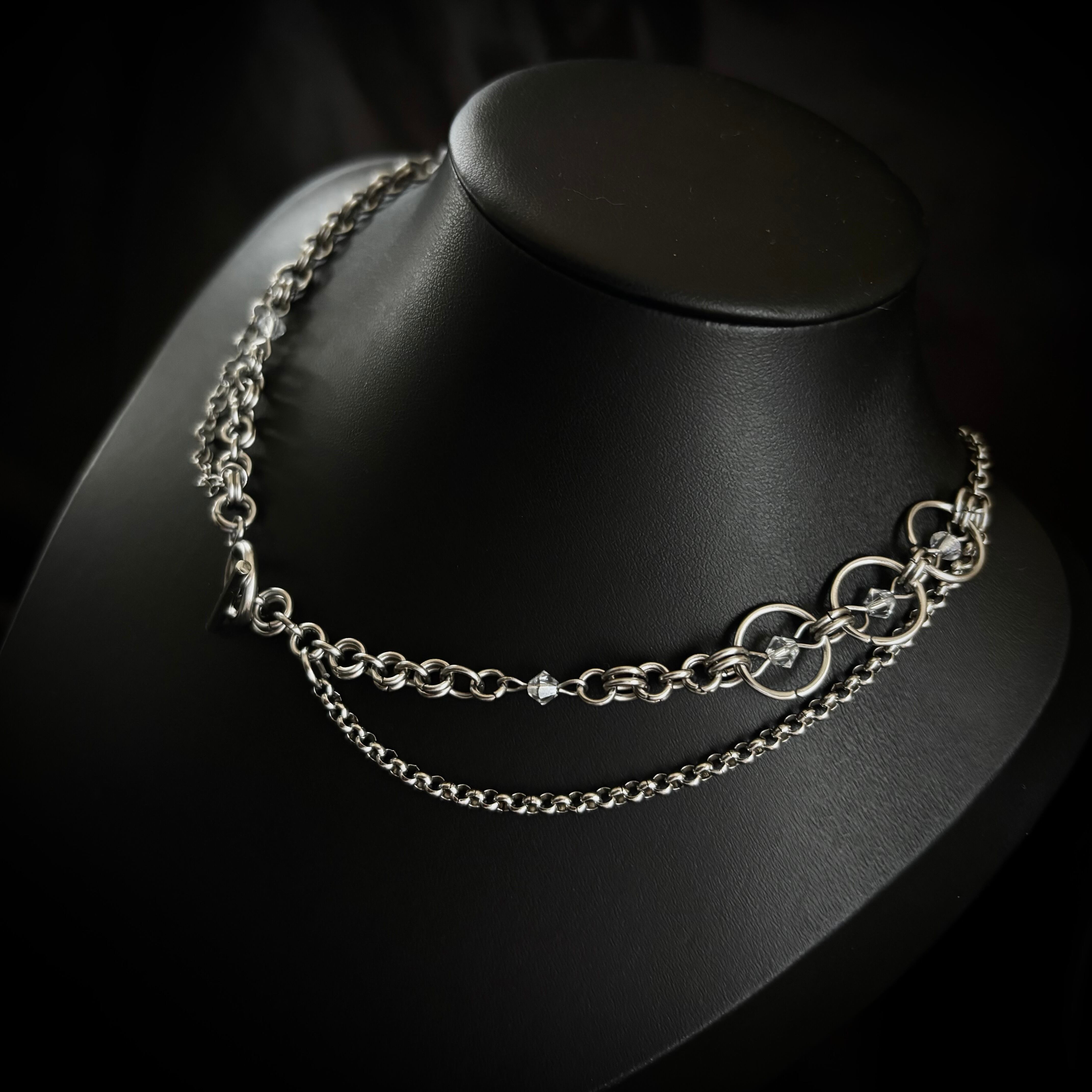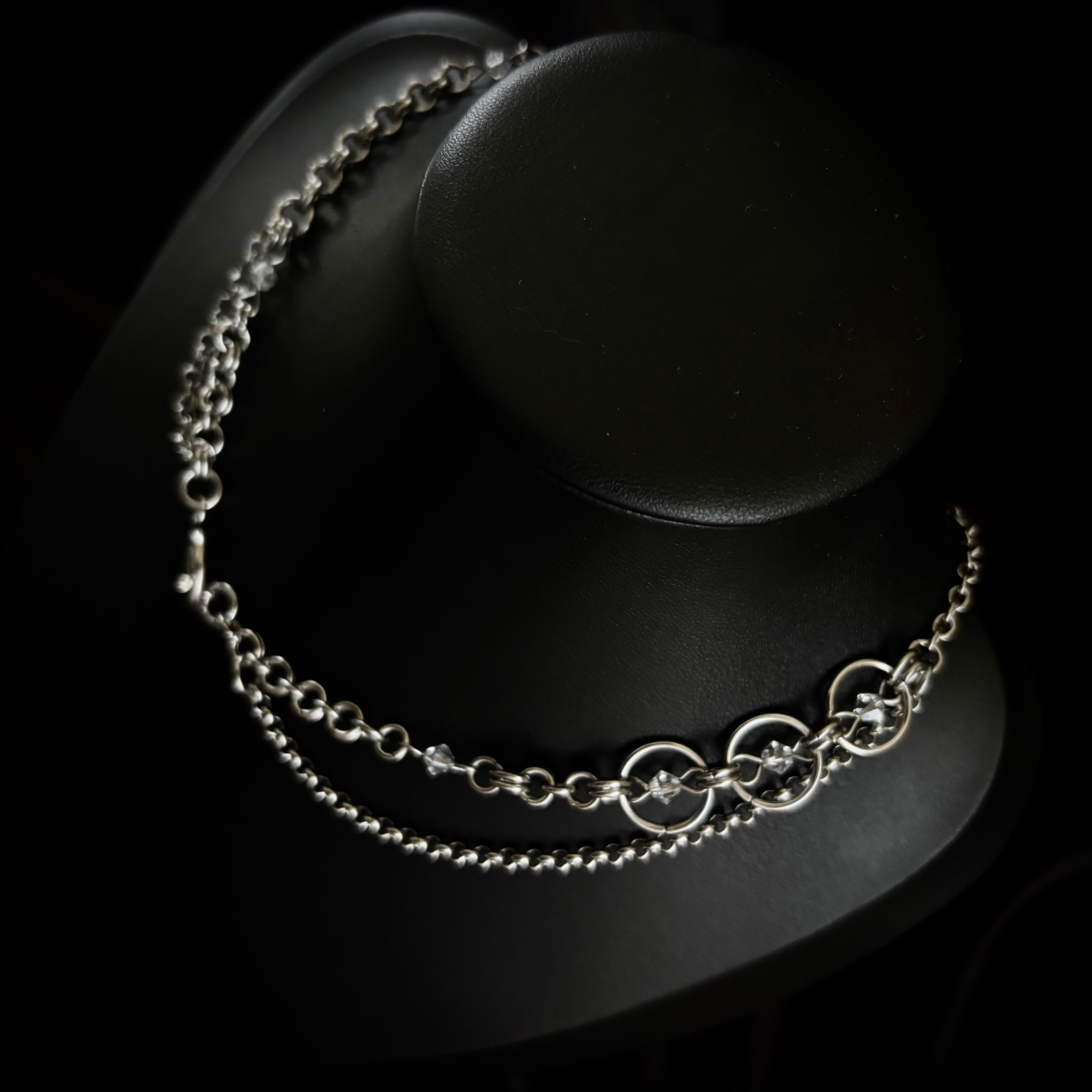 ♡クリスタルとチェインメイル、2種類のチェーンを使用したチョーカーネックレス